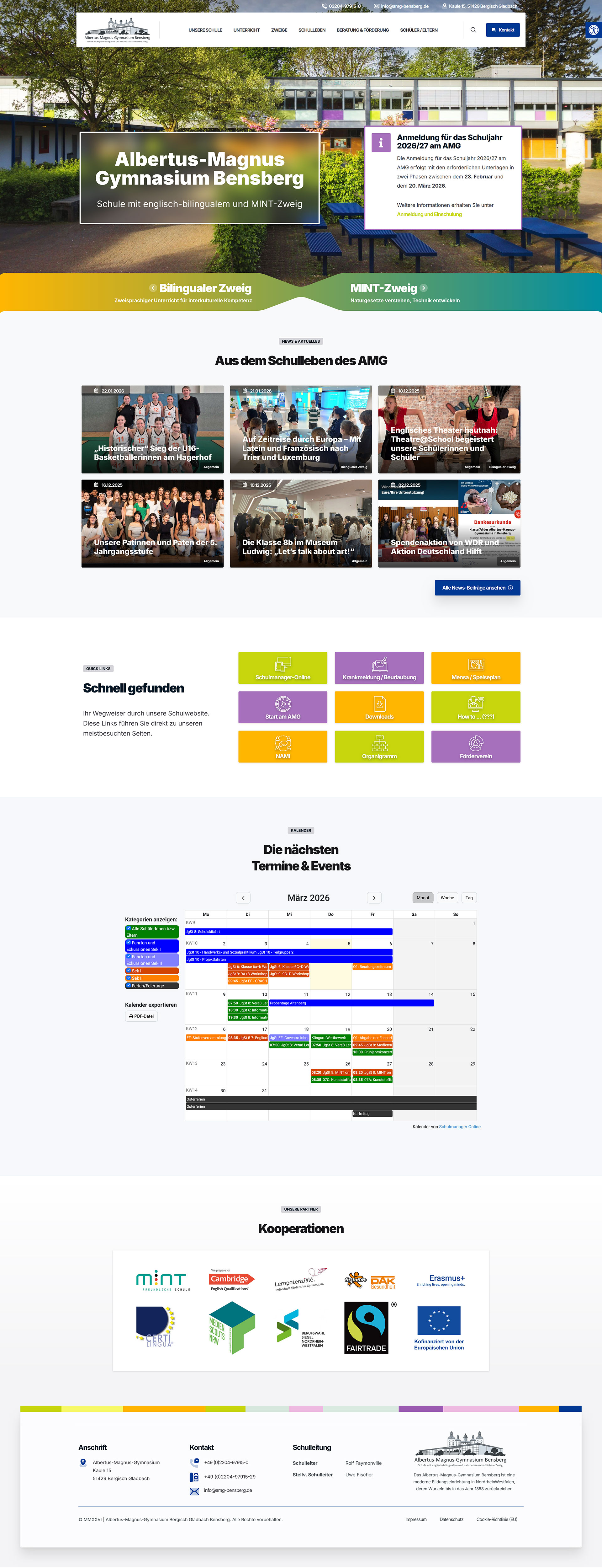 Zwei Schwerpunkte, ein klares Konzept Inhaltlich lag die Herausforderung darin, die beiden prägenden Profile der Schule – den MINT-Zweig und das bilinguale Angebot – prominent und nutzerfreundlich zu bündeln. Über ein übersichtlich strukturiertes Mega-Menü und den gezielten Einsatz interaktiver Elemente navigieren Besucher heute mühelos durch das komplexe Angebot. Auch die Nachrichtenbeiträge haben wir so aufgebaut, dass Neuigkeiten und Updates exakt den passenden Schulzweigen zugeordnet werden können.Bei der Terminübersicht haben wir auf eine smarte Integration statt auf eine Eigenentwicklung gesetzt: Die Website zieht sich die Termine direkt und nahtlos aus dem schulinternen „Schulmanager“. Das bedeutet für das Sekretariat null Mehraufwand und garantiert, dass Eltern und Schüler immer den aktuellsten Stand vor sich haben.