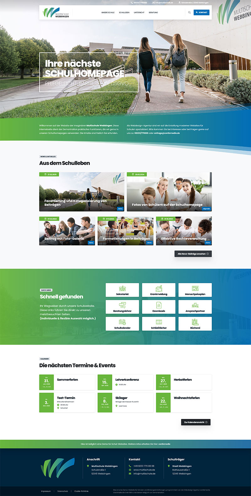 Auch bei Websites für Schulen sind die Geschmäcker verschieden. Was aber die Funktionen anbelangt, decken sich die Anforderungen bei fast allen Anfragen. Daher haben wir eine Schulhomepage-Demo (aktuell in der Version 2025) gestaltet, in der wir die eine Auswahl praktischer Tools integriert haben und die uns in vielen Projekten als Basis dient.